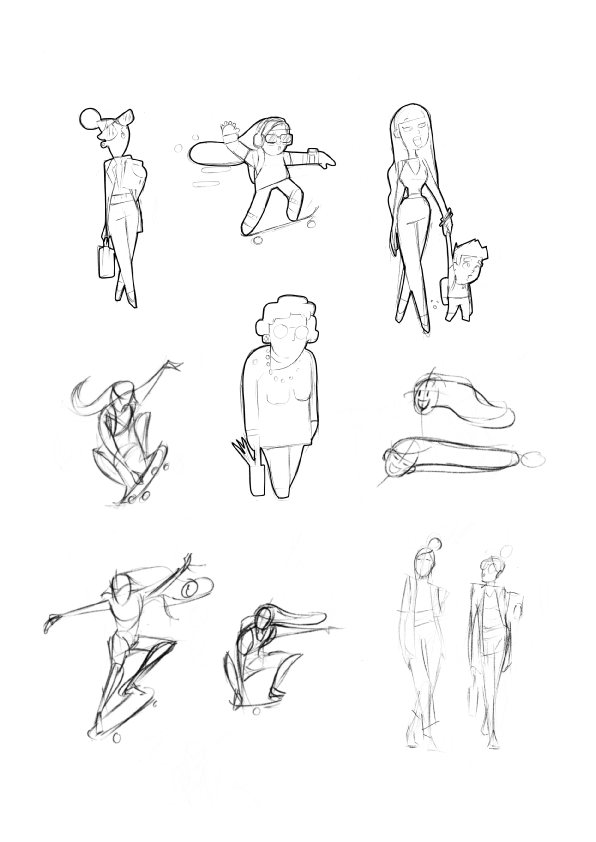 L’identité visuelle de Crazy Pilot repose avant tout sur un travail de character design. J’ai proposé de réaliser l’ensemble des personnages et des éléments graphiques en flat design. Ce choix stylistique apporte la lisibilité nécessaire au jeu de vitesse, ainsi qu’une touche amusante et adaptée à tous les âges. Chaque élément devait apparaître à un endroit précis sur la carte. C’était d’ailleurs l’un plus gros défi, puisqu’il a fallu créer et intégrer plus d’une centaine de personnages et d’éléments 2D différents pour peupler cet univers chaotique.